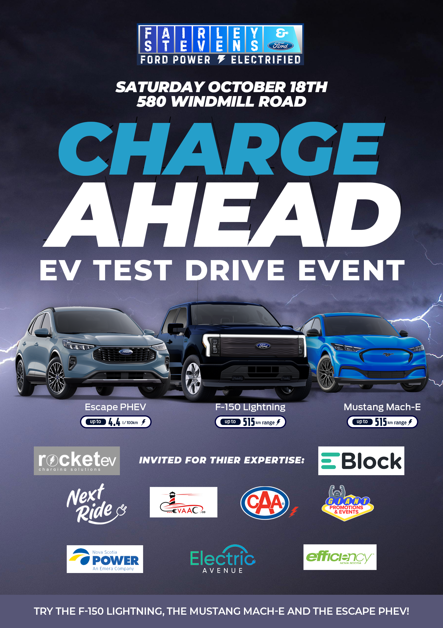 Saturday 18th October, 10-3pm will be our second EV event this year, and it has continued to build momentum and support from local partners. We’re excited to welcome organizations such as Nova Scotia Power, Efficiency Nova Scotia, CAA, and Nextride, who will be on site to share their expertise and answer questions. In addition, Rocket EV will be joining us to support the Ford Power Promise program.